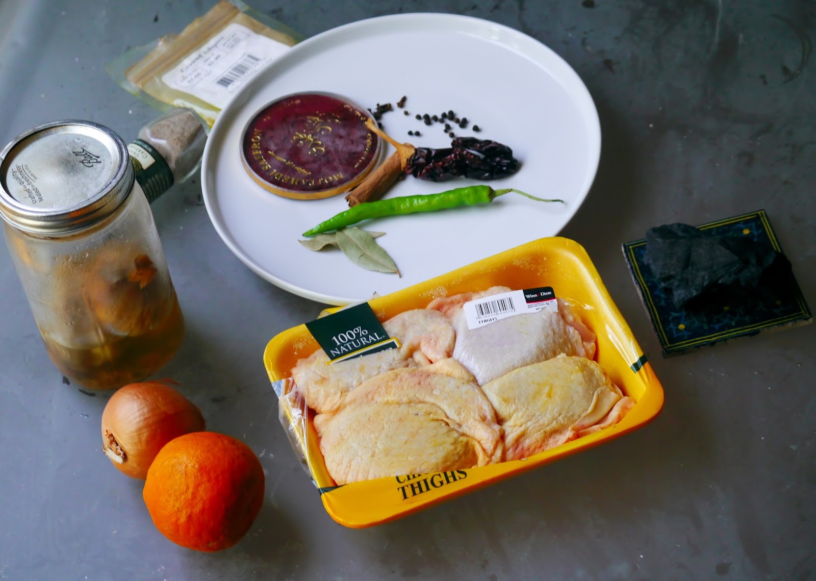 Marinate the chicken In grated onion, 1 TSP of salt, and lemon juice. In a heavy pot, mix all the ingredients (including the marinade), except for the chicken. Thread the chicken thighs onto skewers.
